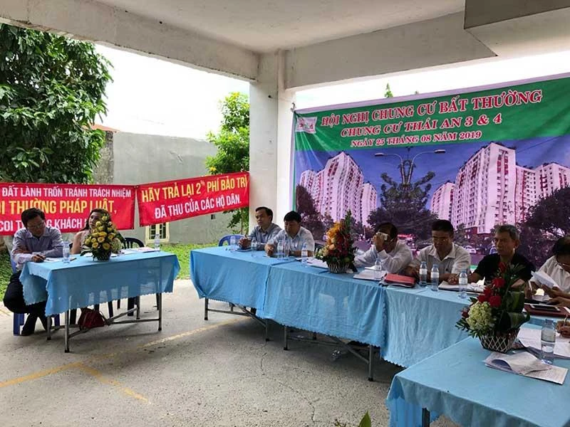 Cư dân chung cư Thái An 3-4, quận 12, TP.HCM căng băng rôn đòi quyền lợi tại hội nghị bất thường chung cư tổ chức ngày 25-8. Ảnh: KC