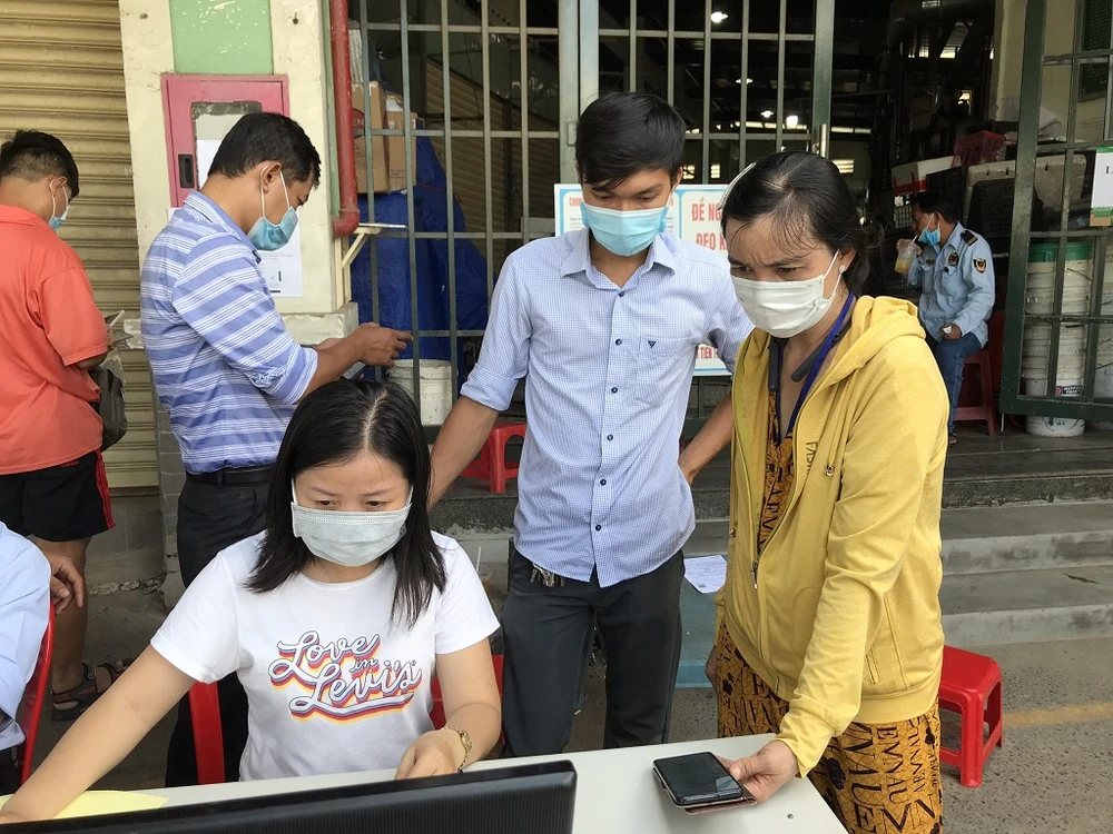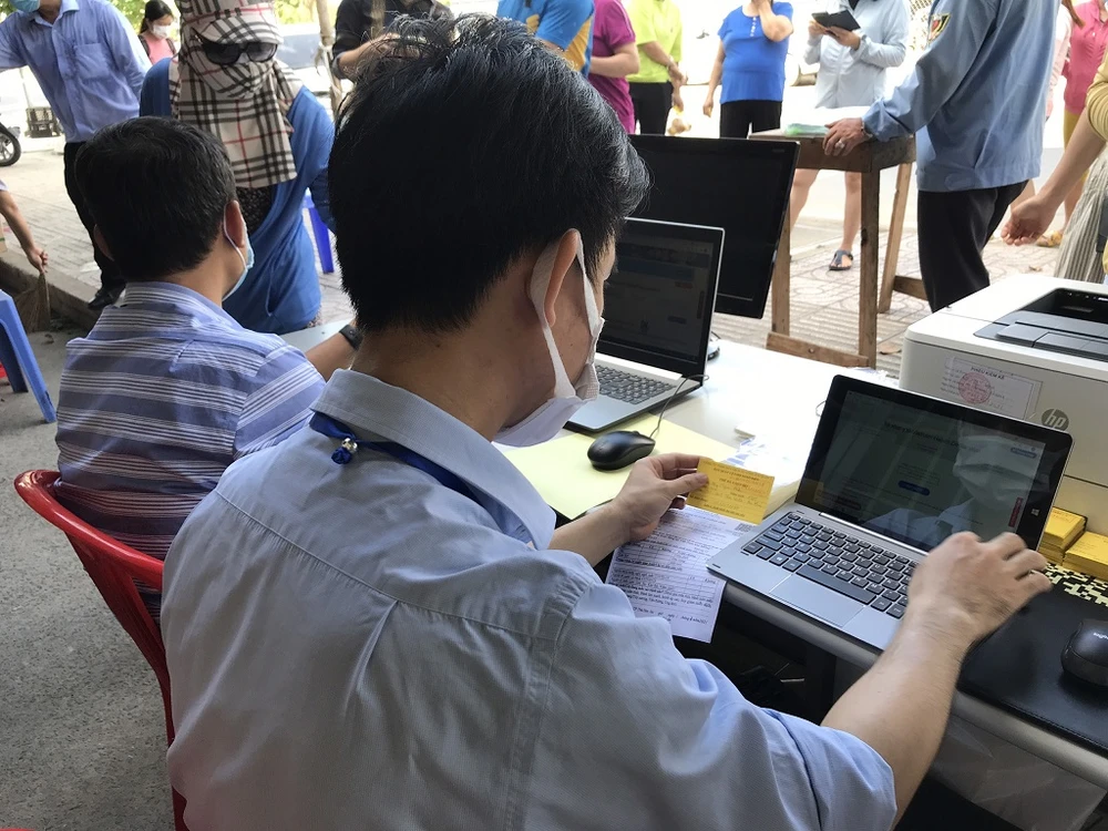 Sau khi hoàn thành phiếu thông tin, cán bộ sẽ nhập liệu thông tin người dân lên hệ thống và cấp mã QR-Code cho lần đi chợ tiếp theo. ẢNH: THANH TUYỀN