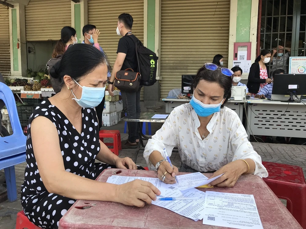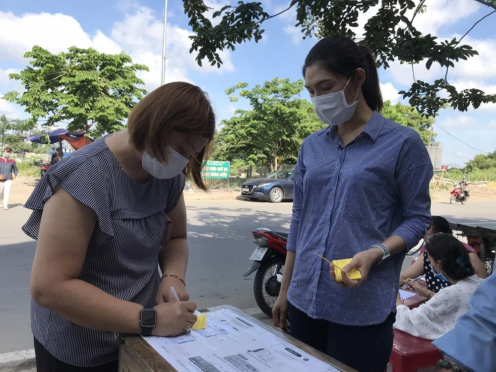 Người dân đến chợ Thảo Điền sáng nay được hướng dẫn thực hiện khai báo y tế và điền thông tin vào phiếu mua hàng. ẢNH: THANH TUYỀN