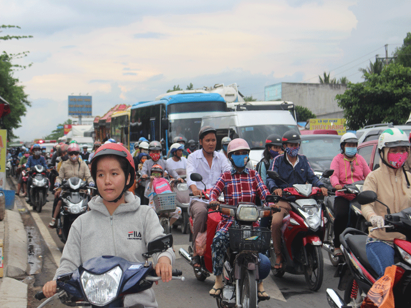 Do bị chốt chặn, thời điểm này lượng phương tiện trên tuyến QL60 hướng Bến Tre đi Tiền Giang đổ dồn về chân cầu Rạch Miễu khiến giao thông trên tuyến bị ùn ứ kéo dài.