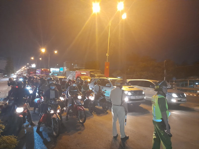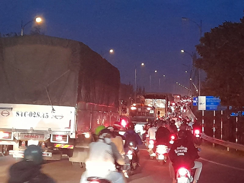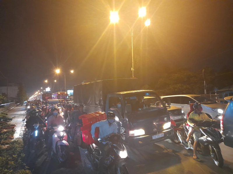 Do phải lưu thông từng đợt, trong khi dòng người và phương tiện càng về tối càng đông khiến QL60 đoạn dẫn lên cầu Rạch Miễu phía bờ Tiền Giang bị ùn ứ kéo dài.