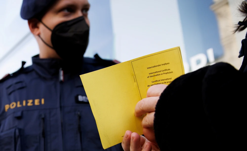 Cảnh sát kiểm tra giấy xác nhận tiêm ngừa COVID-19 ở một cửa hàng tại Áo. Ảnh: REUTERS