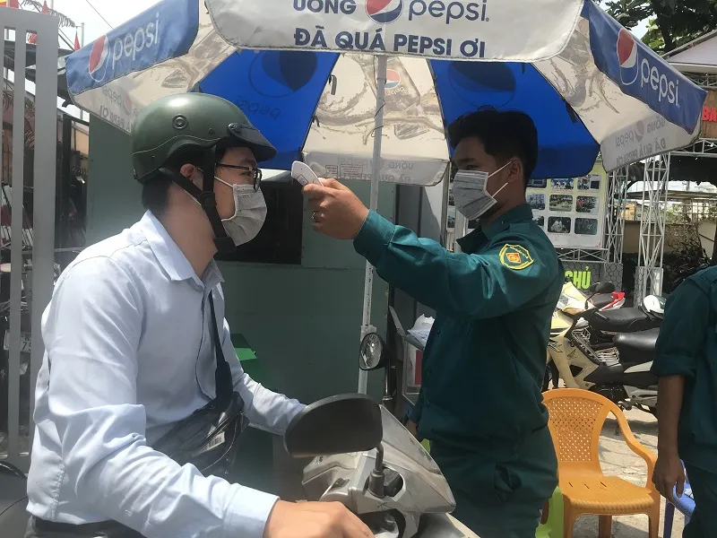 Người dân được đo thân nhiệt trước khi vào cổng UBND phường Linh Tây (quận Thủ Đức). Ảnh: THANH TUYỀN