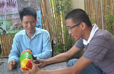 Anh Phúc (bìa trái) và bạn là Hoàng Kim Anh Tú đang bàn về các ý tưởng mới để đóng góp cho chính quyền TP Đà Nẵng. Ảnh: TT