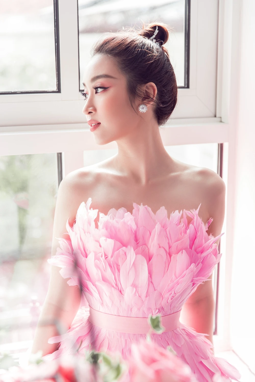 Chiếc váy cầu kỳ được đính kết lông vũ hồng và xếp tầng tỉ mỉ đã làm cho nàng hậu tăng thêm độ nữ tính.