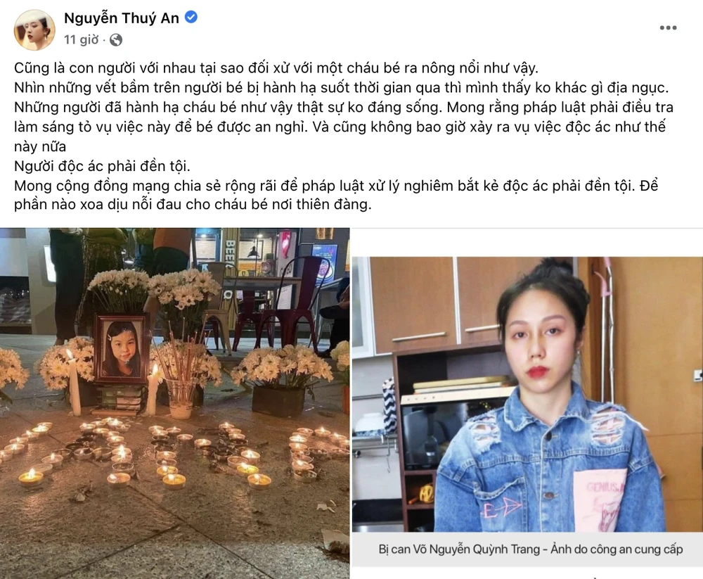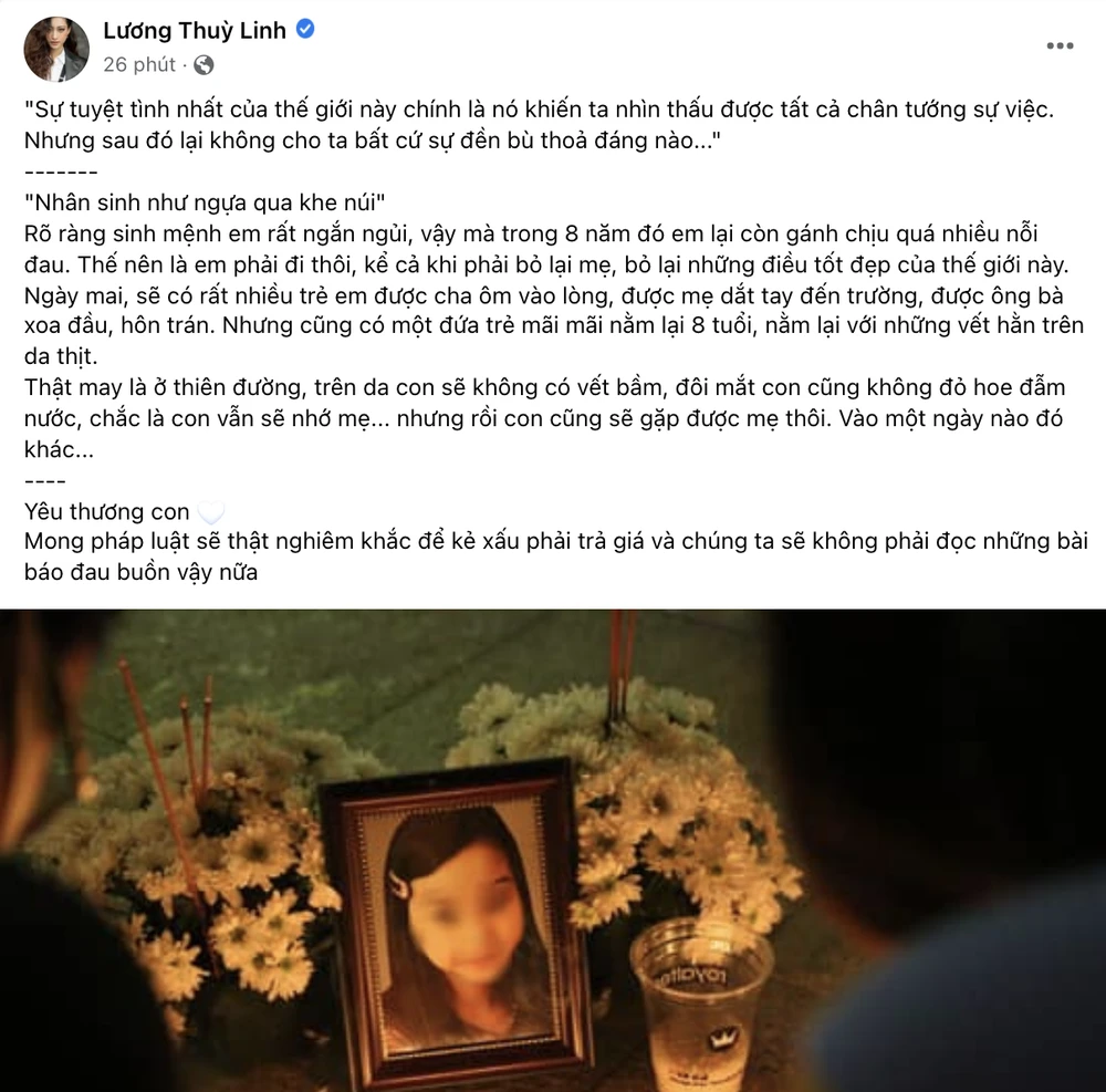 Hoa hậu Lương Thuỳ Linh cũng nghẹn ngào trước sự ra đi của cô bé 8 tuổi này đồng thời cũng mong muốn pháp luật sẽ nghiêm khác với kẻ xấu để các “chủ nhân tương lai của đất nước” được bảo vệ và nâng niu.