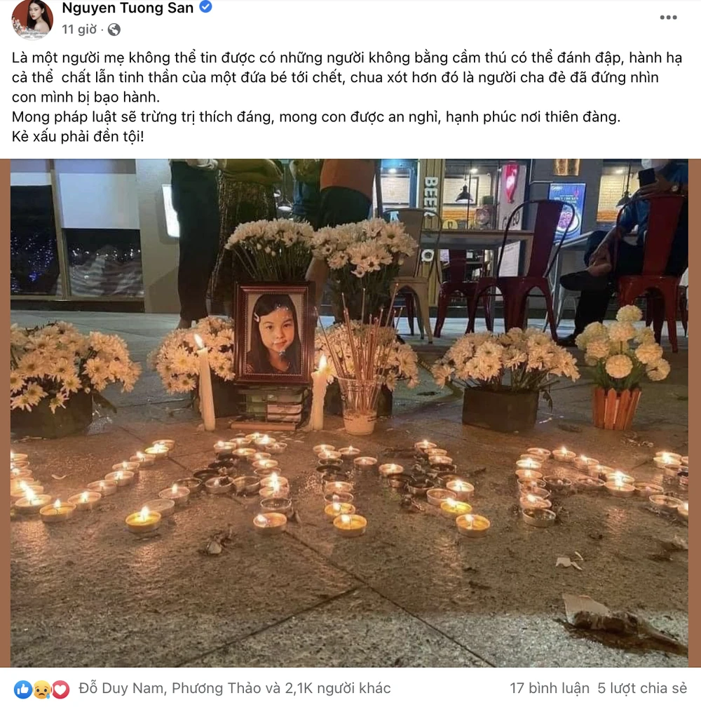 Là một người mẹ, sự việc thương tâm của V.A khiến Á hậu Tường San xót xa khi liên tục phải đọc thông tin về những vấn nạn trẻ em bị bạo hành đến tử vong. Cô bày tỏ sự bức xúc khi không thể tin được có những người không bằng cầm thú có thể đánh đập, hành hạ cả thể chất lẫn tinh thần của một đứa bé tới chết, chua xót hơn đó là người cha đẻ đã đứng nhìn con mình bị bạo hành. Nàng hậu 1 con cũng hy vọng rằng pháp luật sẽ trừng trị thích đáng, mong con được an nghỉ, hạnh phúc nơi thiên đàng.
