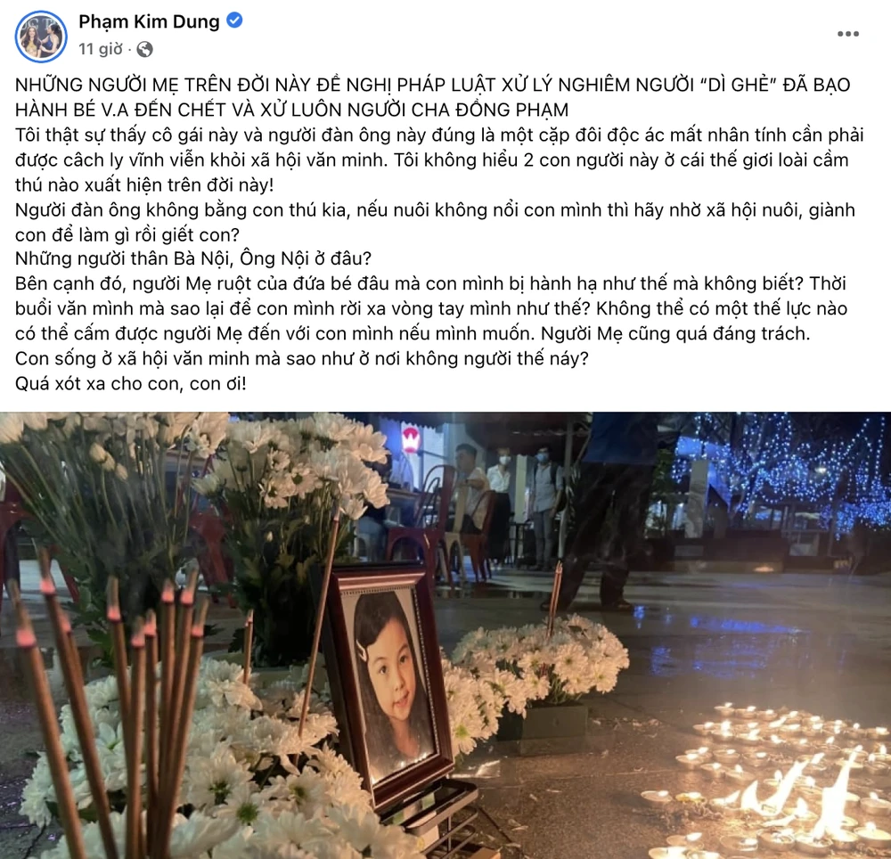 Bà Phạm Kim Dung đau lòng và thậm chí đã mất ngủ với những gì đã xảy ra với bé V.A đáng thương. Bà cho rằng: “Những người mẹ trên đời này đề nghị pháp luật xử lý nghiêm người “dì ghẻ” đã bạo hành vé V.A đến chết và xử lý luôn người cha đồng phạm!”