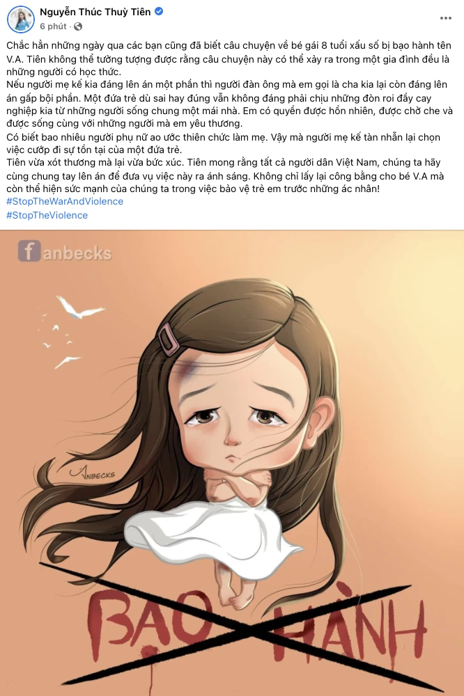 “Tiên vừa xót thương mà lại vừa bức xúc. Tiên mong rằng tất cả người dân Việt Nam, chúng ta hãy cùng chung tay lên án để đưa vụ việc này ra ánh sáng. Không chỉ lấy lại công bằng cho bé V.A mà còn thể hiện sức mạnh của chúng ta trong việc bảo vệ trẻ em trước những ác nhân!”- Thùy Tiên bày tỏ.