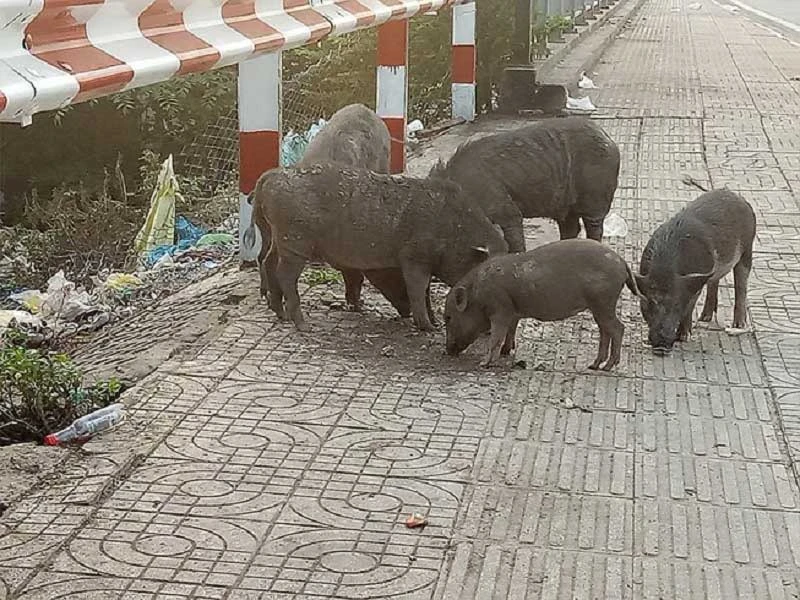 Đàn heo thả rông bị người dân phản ứng trên đường Phạm Văn Đồng, quận Bình Thạnh nay đã giảm số lượng. Ảnh: T.PHƯƠNG