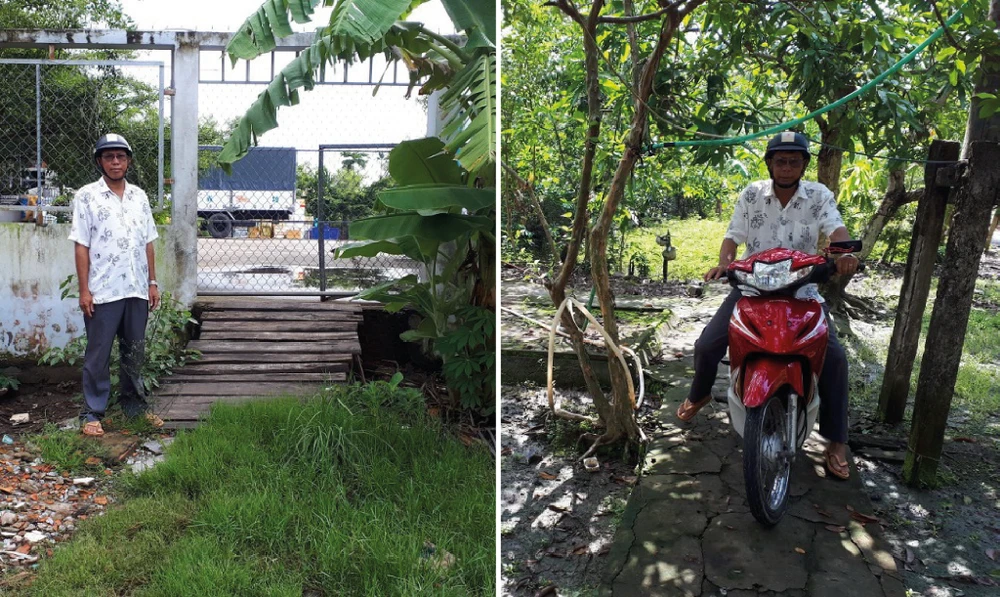 Đường lộ cũ đã bị chành xe Tỷ Phúc chiếm và chắn rào ngang (ảnh trái) nên ông Hoàng phải đi nhờ đường vườn người khác (ảnh phải). Ảnh: TRẦN VŨ