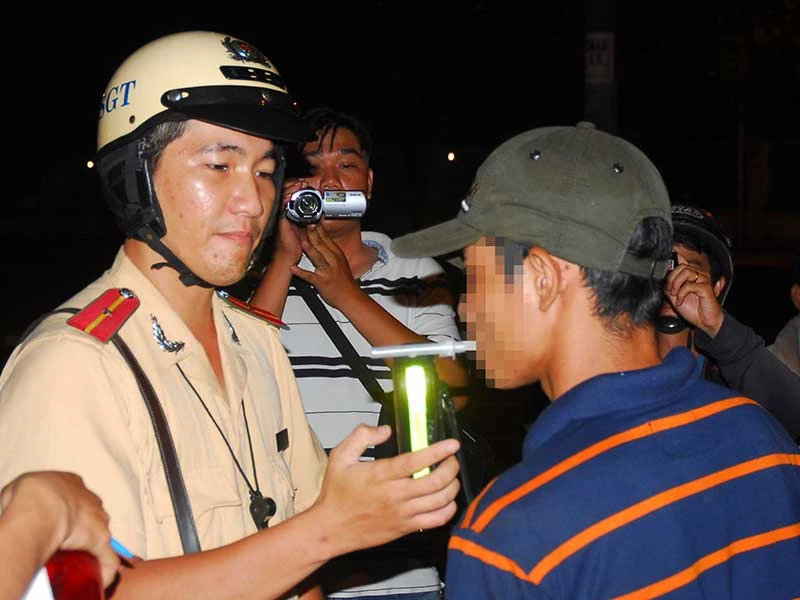 CSGT đang đo nồng độ cồn một người điều khiển xe máy trên đường Hùng Vương, quận 5, TP.HCM.Ảnh: HTD