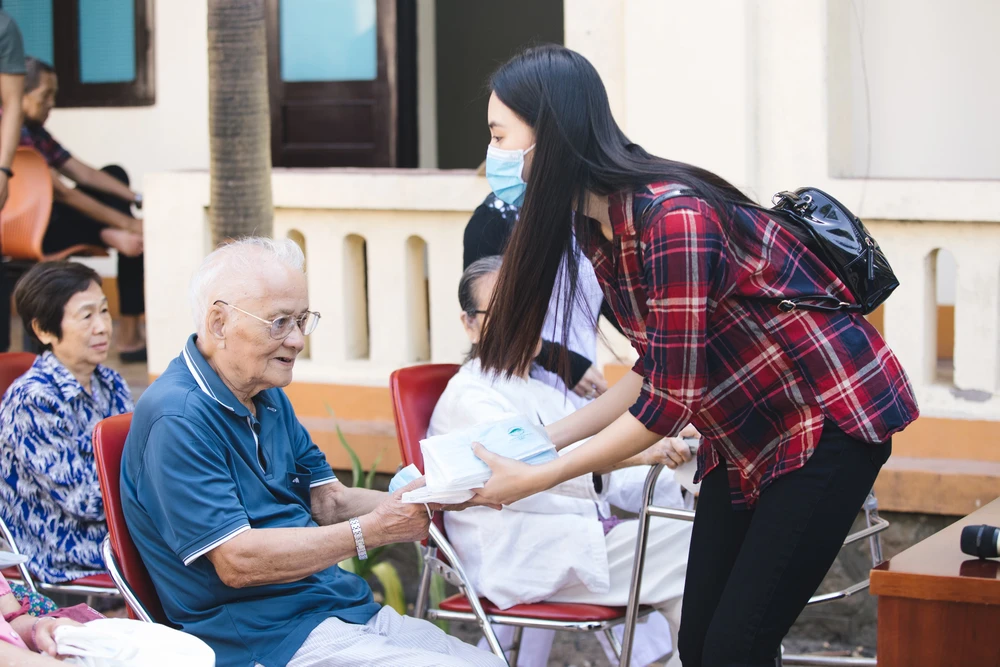 Hoa hậu Tiểu Vy trao quà cho người khó khăn.