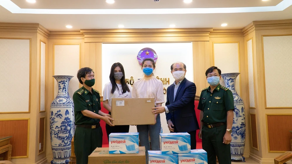 Hoa hậu Lương Thùy Linh và Hoa hậu Tiểu Vy trao quà hỗ trợ.