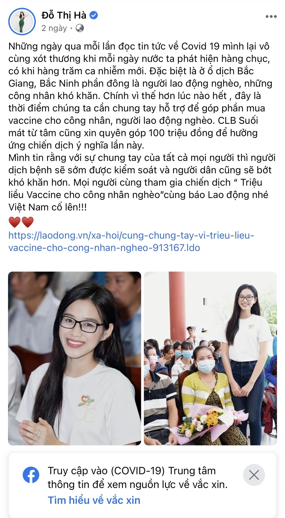 Hoa hậu Đỗ Hà chia sẻ: “Những ngày qua mỗi lần đọc tin tức về COVID-19 mình lại vô cùng xót thương khi mỗi ngày nước ta phát hiện hàng chục, có khi hàng trăm ca nhiễm mới.