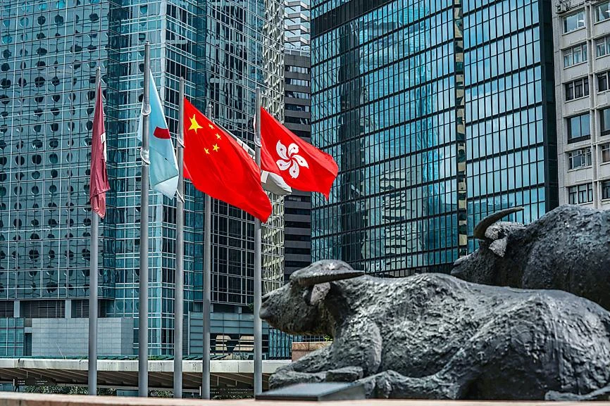 Cờ Trung Quốc và Hong Kong bên ngoài một khu phức hợp cao ốc ở Hong Kong. Ảnh: BLOOMBERG