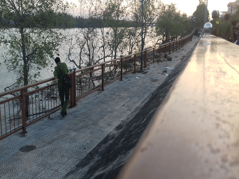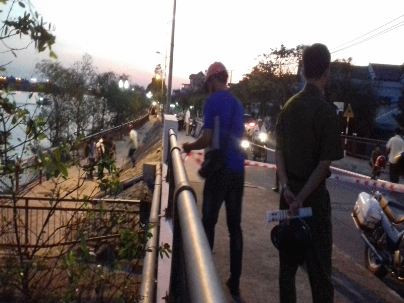 Chiều tối 7-3, lực lượng Cảnh sát hình sự, Cảnh sát giao thông Công an tỉnh Bến Tre và ngành chức năng đã tiến hành phong tỏa hiện trường khu vực bờ kè sông Hàm Luông (trên đường Hùng Vương, thuộc khu phố 4, phường 7, TP. Bến Tre) ngay sau khi nhận được tin báo của người dân phát hiện có tiếng nổ lạ rất lớn phát ra tại đây.