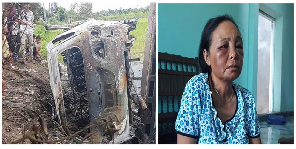 Hiện trường chiếc xe Fortuner bị đốt rụi (ảnh trái) và bà Phúc (ảnh phải) một trong hai phụ nữ bán tăm bị vây đánh