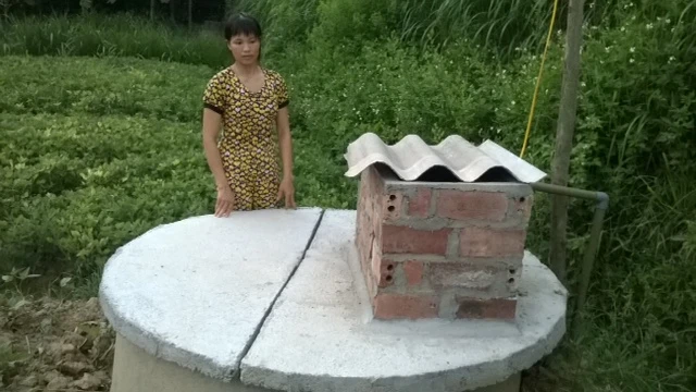 Chị Vũ Thị Lĩnh bên chiếc giếng nước mà vợ chồng chị đã phải cố gắng mới đào được để lấy nước sạch cho cả gia đình.