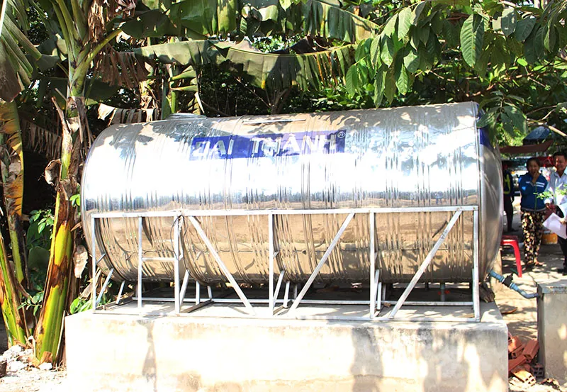Nhiều địa phương vẫn chưa có bình chứa nước để dùng. Trong ảnh là một bình chứa nước ở xã An Nhơn Tây. Ảnh: LÊ THOA
