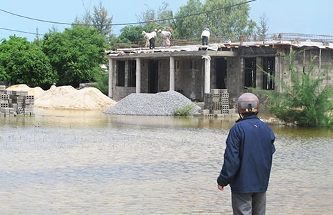 Chỉ một cơn mưa lớn sáng 22-10, cả khu tái định cư thôn Vịnh Hòa, xã Xuân Thịnh, thị xã Sông Cầu (Phú Yên) bị nhấn trong biển nước: Đường bê tông ngập hơn nửa mét, những khu đất trống thành ao hồ, trường mẫu giáo đang xây dở “nổi” trên mặt nước…