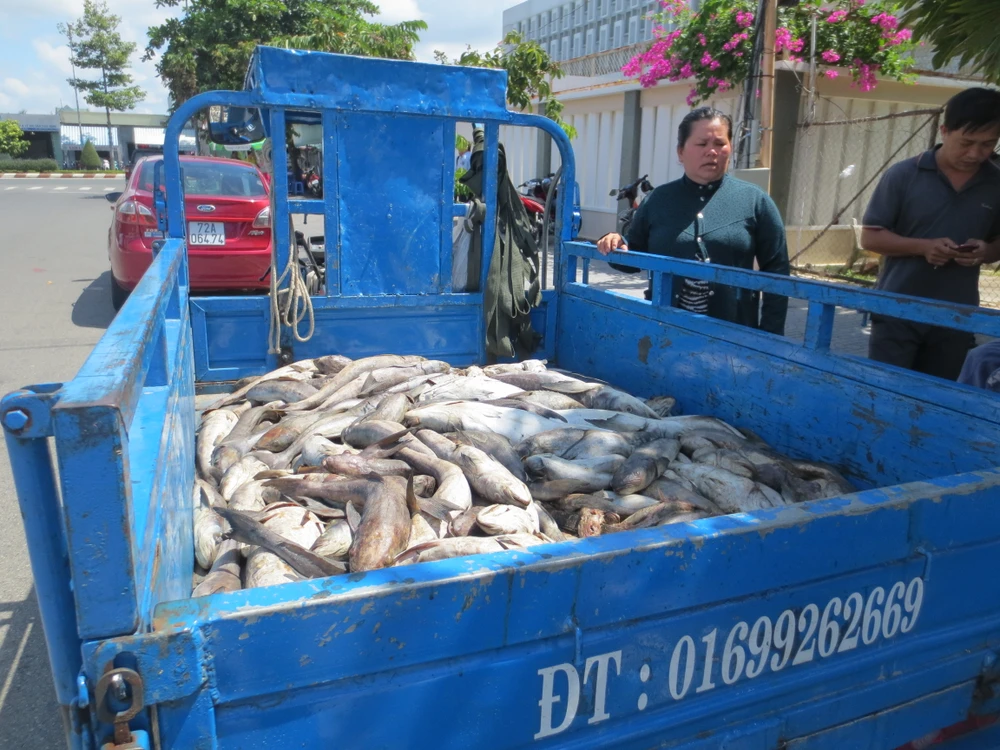 Cá bị chết trắng hàng loạt được dân mang tới trụ sở UBND tỉnh. Ảnh LĐO