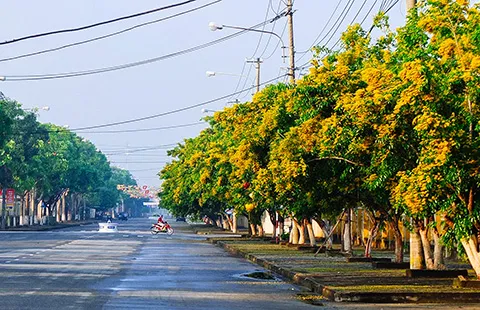 Hình ảnh thanh bình quen thuộc của TP Tam Kỳ với hai hàng cây sưa trên đường Trần Hưng Đạo. Ảnh: NGUYỄN TUYÊN