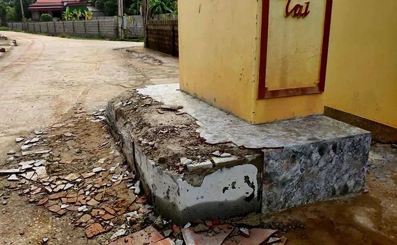Phần bê tông quanh chân cổng làng bị nhóm người đập phá chưa thành.