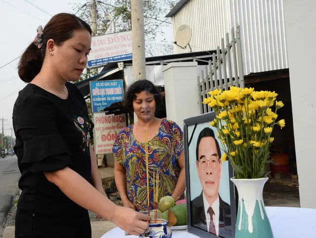 Chị Châu Thị Liên (34 tuổi, ở ấp Trung, xã Tân Thông Hội, huyện Củ Chi) lập bàn thờ trước nhà để tưởng nhớ bác Sáu Khải. Ảnh: NGỌC KHẢI