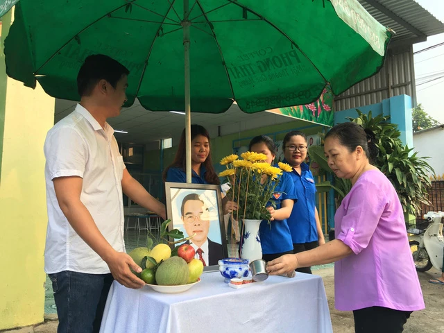 Thầy cô giáo Trường Mầm non Thành Danh, xã Tân Thông Hội lập bàn thờ ông Sáu Khải. Ảnh: TỰ TRUNG
