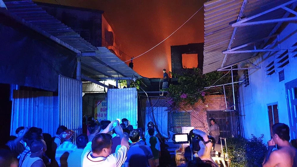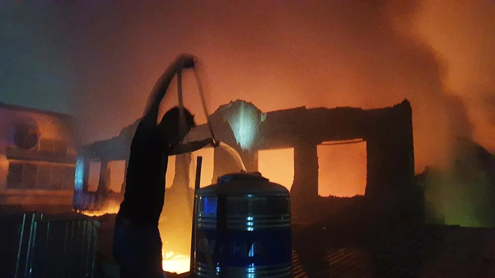 Nhiều ngôi nhà lân cận bị cháy lan, người dân phải leo lên mái tôn, dùng ống bơm hút nước dập lửa trong hoảng hốt.