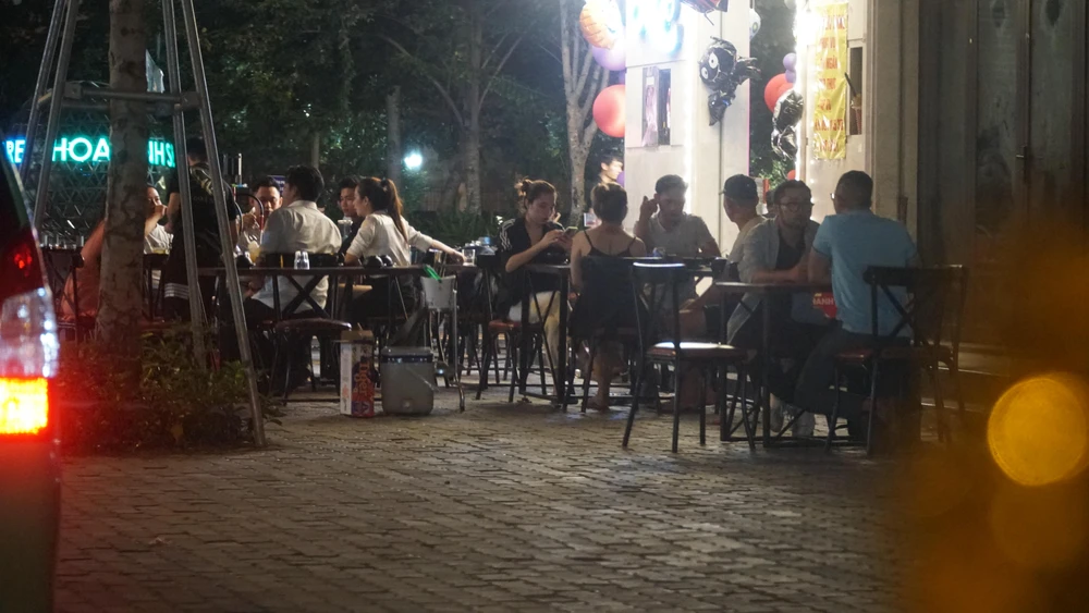 Càng về khuya thì các nhà hàng trên đường số 3 lại càng đông khách và chiếm dụng hết phần vỉa hè làm nơi ăn nhậu. Ảnh: HỮU ĐĂNG |