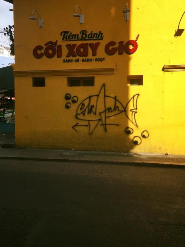 Trước đó, khoảng 1 tháng, bức tường vàng bị kẻ lạ mặt vẽ hình chú cá mập lên đó. Ngay sau đó, chủ tiệm bánh đã nhanh chóng sơn lại để phục vụ khách hàng.
