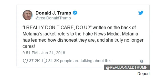 Bên cạnh đó, Tổng thống Donald Trump cũng lên tiếng bảo vệ vợ bằng một phát biểu trên trang cá nhân Twitter: ""Tôi thực sự không quan tâm, còn bạn thì sao" trên áo của Đệ nhất phu nhân ám chỉ đến những đám truyền thông đưa tin sai sự thật. Melania đã nhận thấy họ thiếu trung thực thế nào, và cô ấy thực sự không còn quan tâm nữa".