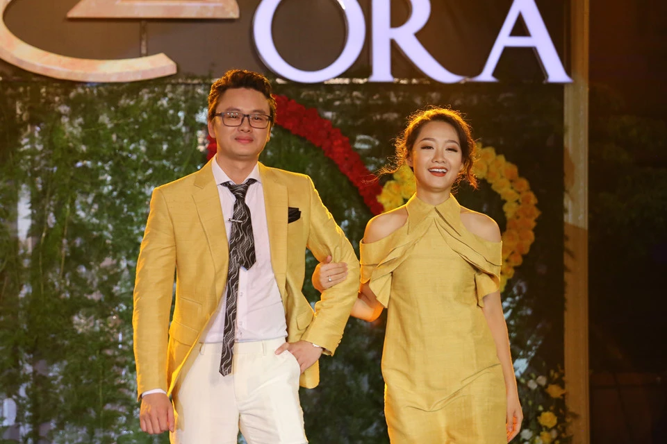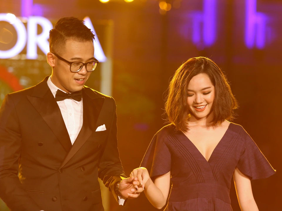 Thu Hà sải bước cùng BTV thời sự Hữu Bằng.