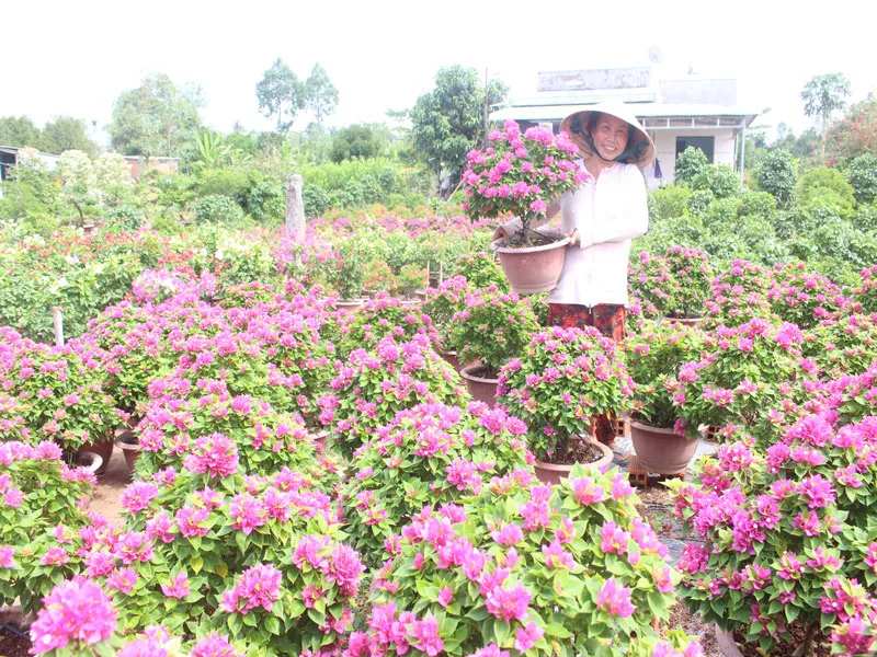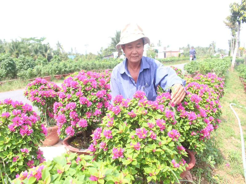 Ông Phan Thế Dũng (ấp Lân Đông, xã Phú Sơn), một nhà vườn trồng hoa giấy lâu năm, cho biết để chuẩn bị vụ hoa tết, vào cuối tháng 11, đầu tháng 12 âm lịch, người dân bắt đầu cắt tỉa đọt cho thật khéo léo, tạo hình cho cây để nửa cuối tháng 12 là cây bắt đầu trổ bông rộ kịp bán vào dịp tết.