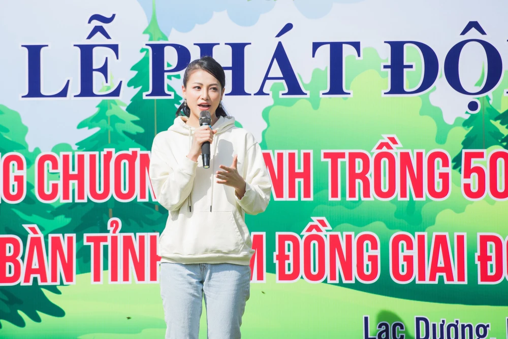Hoa hậu Phương Khánh phát biểu tại lễ phát động chương trình trồng cây.