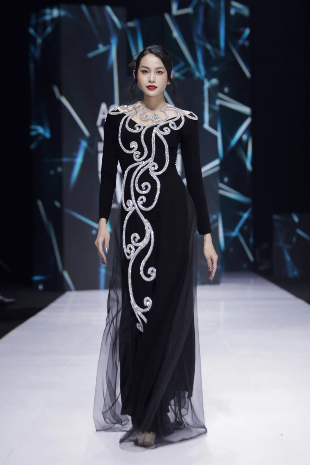 Á hậu Đại Sứ Hoàn Mỹ 2020 Lương Mỹ Kỳ nền nã, dịu dàng trong thiết kế màu đen với tà voan nhẹ nhàng, bay bổng, họa tiết đính đá trắng tinh tế dọc thân áo tạo nên sự thon thả, nhẹ nhàng của người phụ nữ. Ảnh: BTC