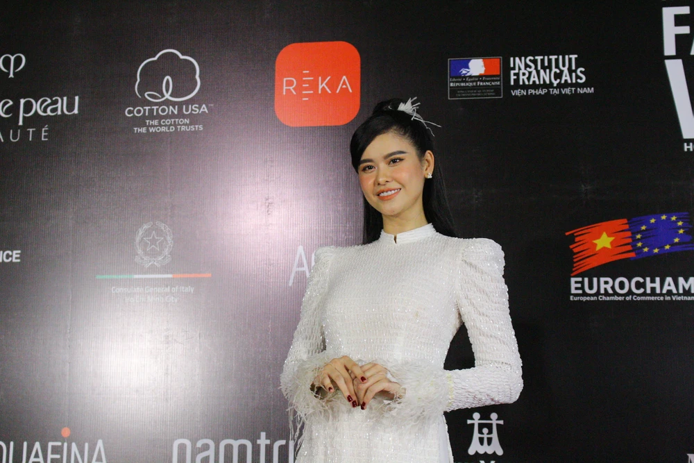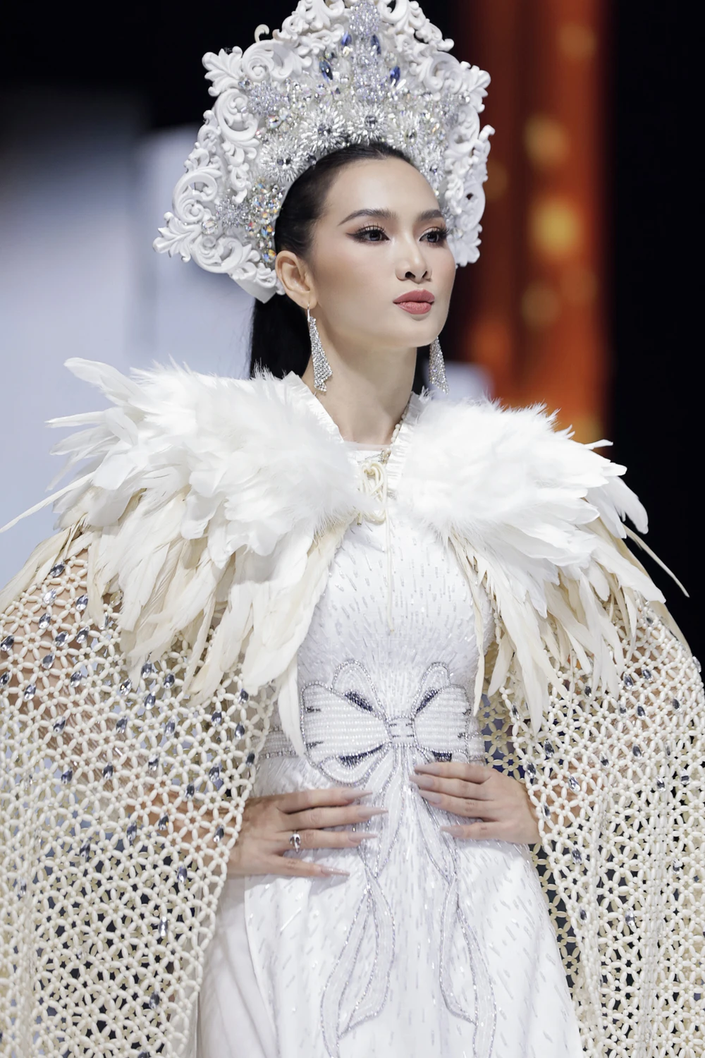 Vedette- người mẫu Anh Thư bước ra dịu dàng, thuần khiết và sang trọng trong tà áo dài trắng với chiếc áo choàng có gắn lông vũ được thiết kế vô cùng tỉ mỉ. Ảnh: BTC