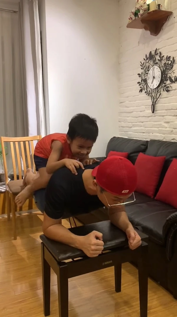 Tuy vậy, thử thách thật sự đối với Thiên Vương là hai bé cưng liên tục quậy phá bố, khiến cho bài plank thêm sức nặng gấp đôi nhưng cũng vui hết mức.