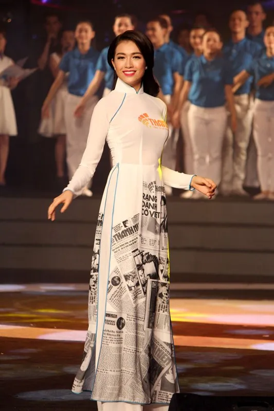 Các người đẹp diện áo dài với họa tiết là phiên bản của báo Thanh Niên qua từng thời kỳ. Ảnh: HOÀNG GIANG