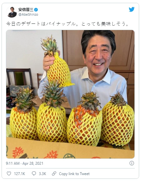 Cựu Thủ tướng Nhật Shinzo Abe thể hiện sự ủng hộ đối với mặt hàng dứa Đài Loan. Ảnh: TWITTER
