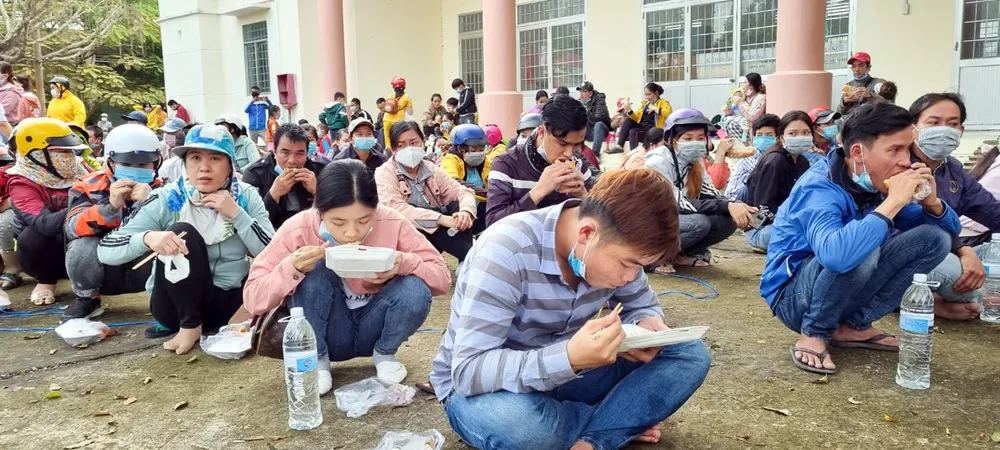 Trong hai ngày qua, có khoảng 7.000 công dân Kiên Giang về quê, những người này được lực lượng chức năng hỗ trợ ăn, uống và test nhanh, sau đó đưa đi cách ly tập trung. Ảnh: VÃN VŨ