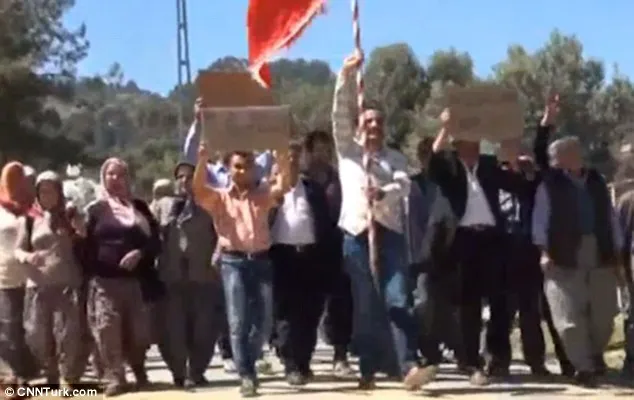 Những người đàn ông Uzumlu giơ biểu ngữ diễu hành biểu tình xung quanh làng. Nguồn: Daily Mail