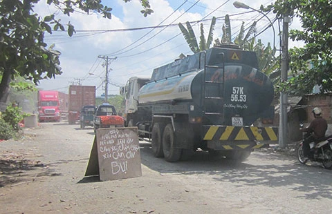 Nhiều năm nay, người dân sống hai bên đường Đào Trí (phường Phú Thuận, quận 7, TP.HCM) phải sống trong cảnh khói bụi, lầy lội vì tuyến đường này đang bị xuống cấp trầm trọng. Quá bức xúc về tình trạng này, người dân đã dựng bảng yêu cầu các xe vận chuyển chậm lại để giảm bụi nhưng tình trạng trên vẫn không được khắc phục.
