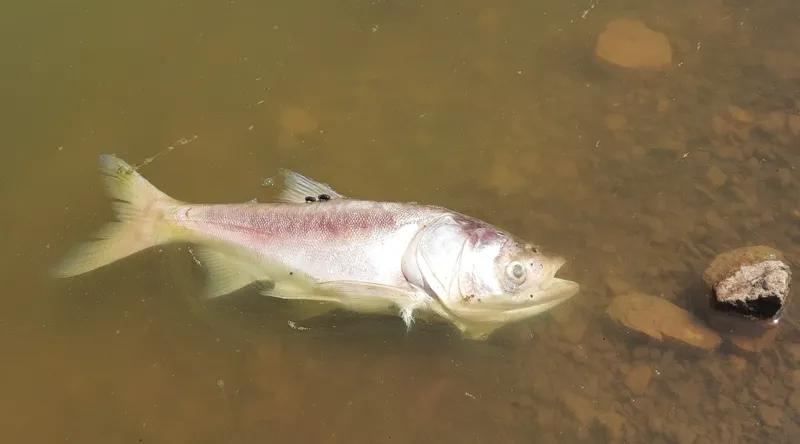 Cá chết nổi trên hồ Tràng Đen ngày 9-8. Ảnh: ĐẮC LAM