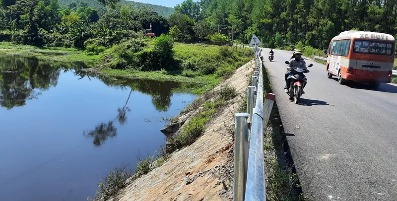 Nước đen đục chảy qua cầu quốc lộ 15A rồi đổ xuống hồ Tràng Đen. Ảnh: ĐẮC LAM