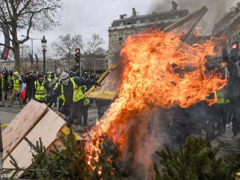 Người biểu tình phóng hỏa gần Khải Hoàn Môn ngày 9-12. Ảnh: GETTY IMAGES