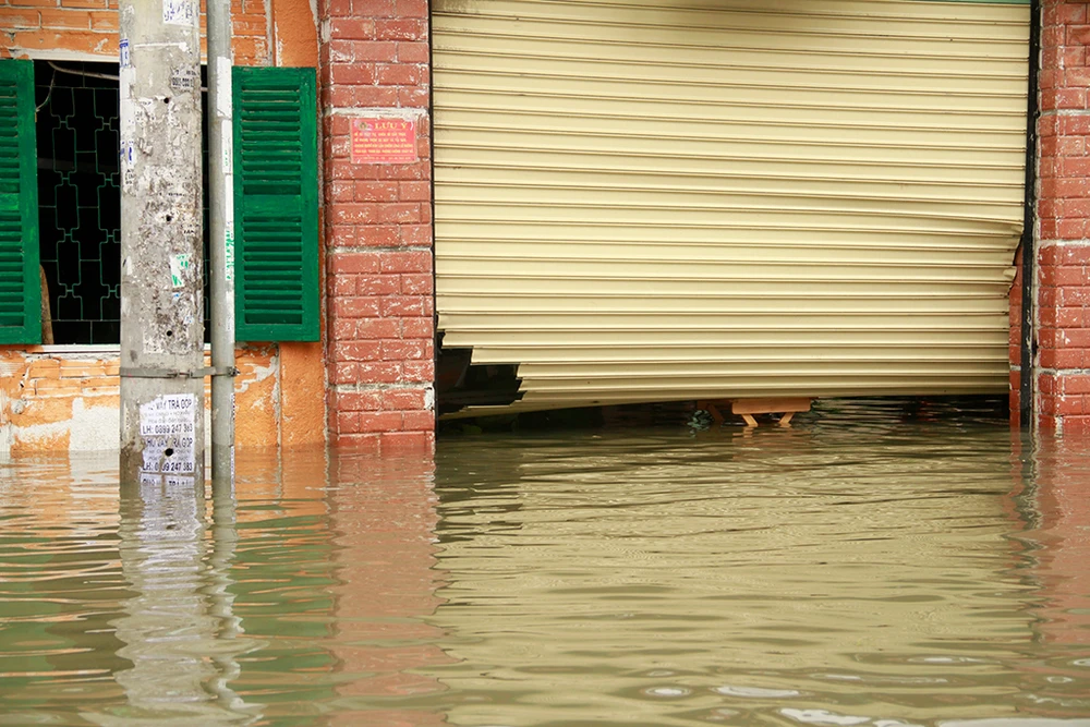 Nước lớn khiến hệ thống cửa cuốn ở nhiều cửa hàng, nhà dân gặp sự cố không hoạt động. Nước do sóng lớn khiến cửa cuốn bị giật bung khỏi bản lề, hư hỏng.