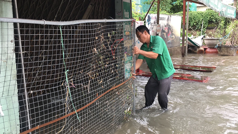 Nước xô đổ cửa một ngôi nhà kinh doanh đồ gỗ nội thất ven đường Phan Huy Ích.